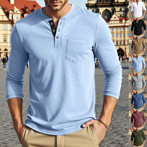 Erkek amerikan tarzı uzun kollu Henley gömlek sınır ötesi-sonbahar streç pamuk rahat taban tişört düğmesi gevşek katı